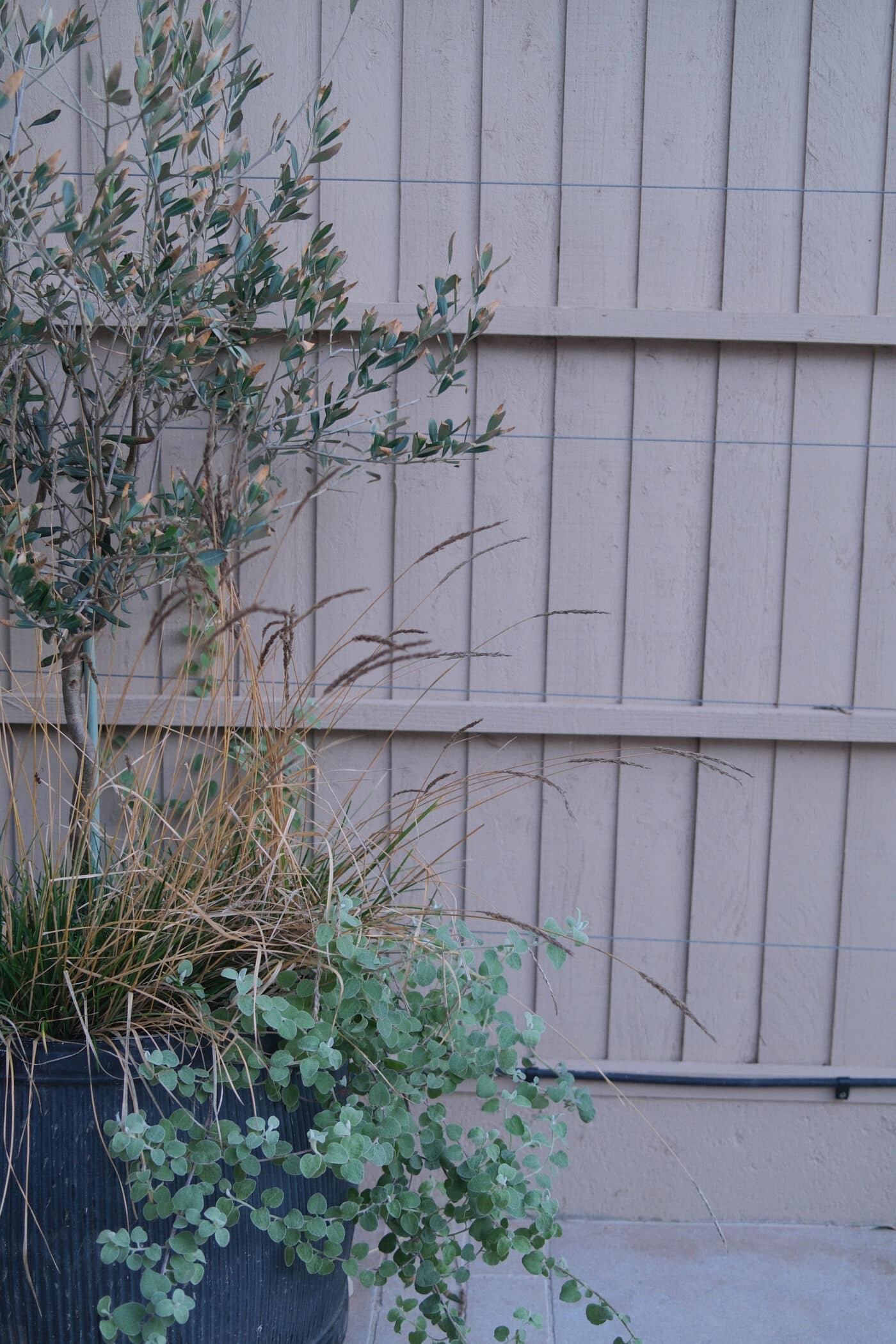 Accompanying pots filled with the holy triumvirate of a Thriller (in the form of an Olive tree), Spiller (here a Helichrysum), and a Filler (here a beautiful flowing, structural grass) help tie everything together.