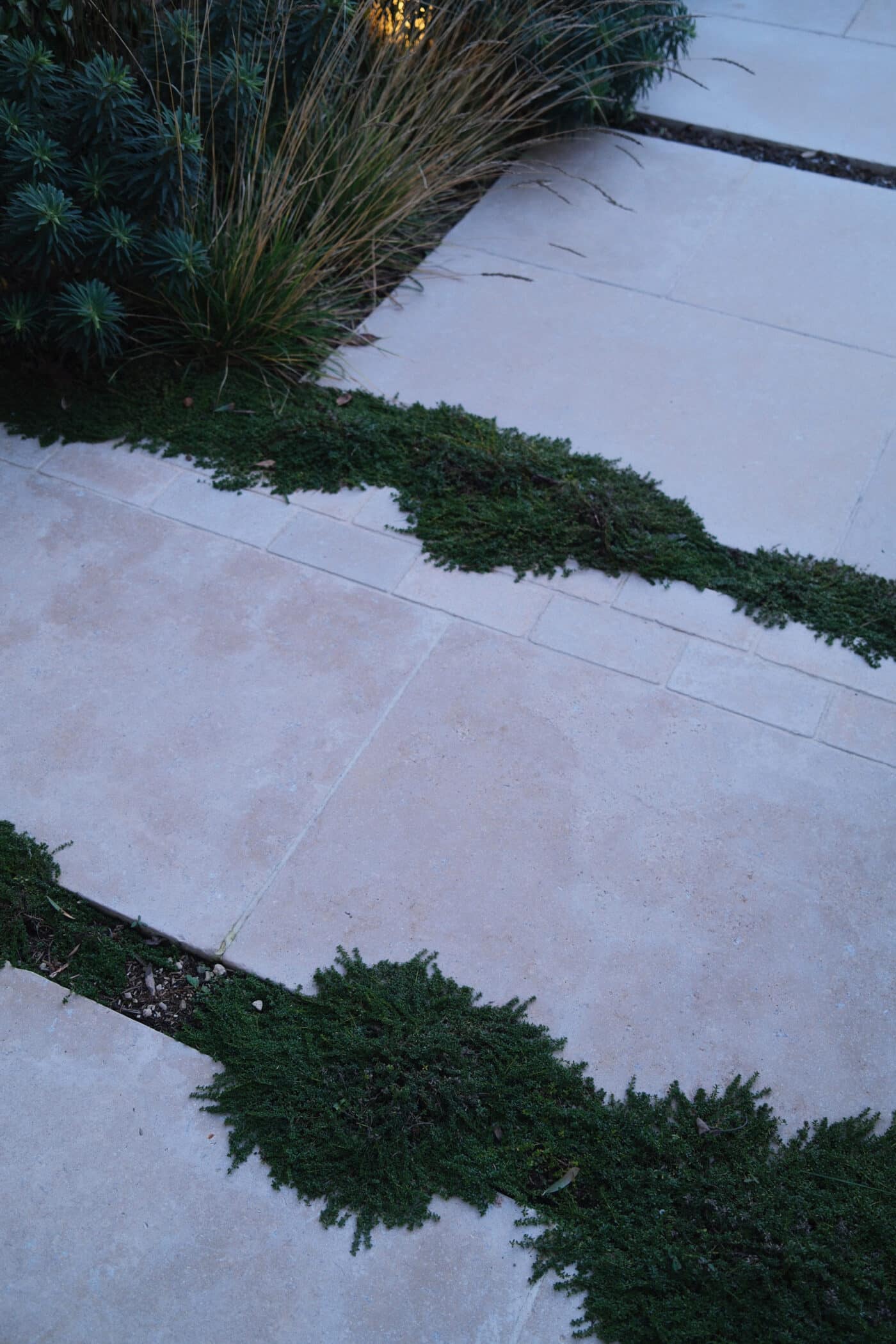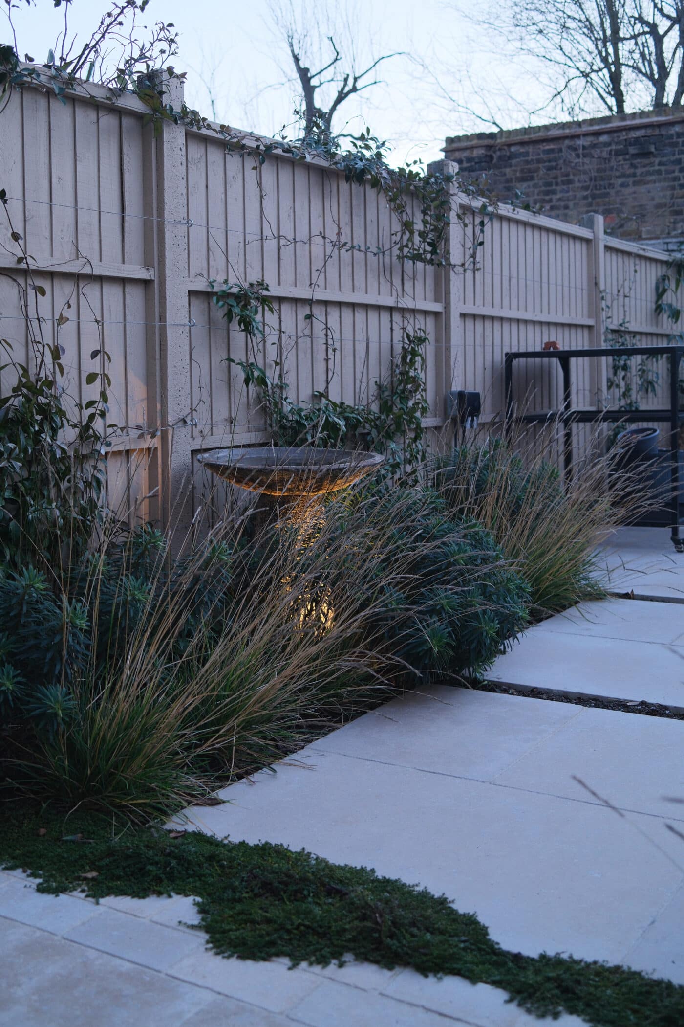 We’re so fond of the Thyme filling the gaps between paving slabs, releasing beautiful aromas every time you brush over it – and all leading the eye towards the bed and its beautiful stone bird table centrepiece.