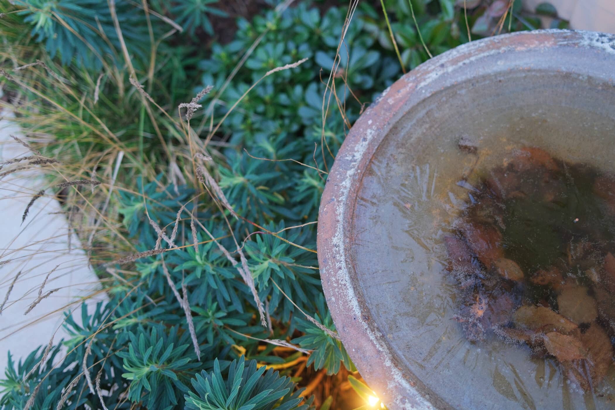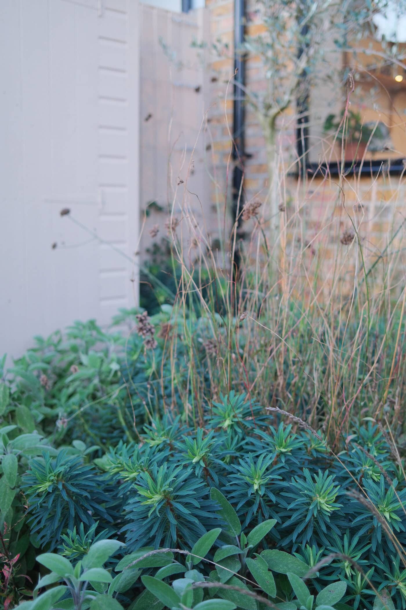 Sage, Euphorbia and grasses left to dry overwinter, providing both habitat and shelter for local wildlife.