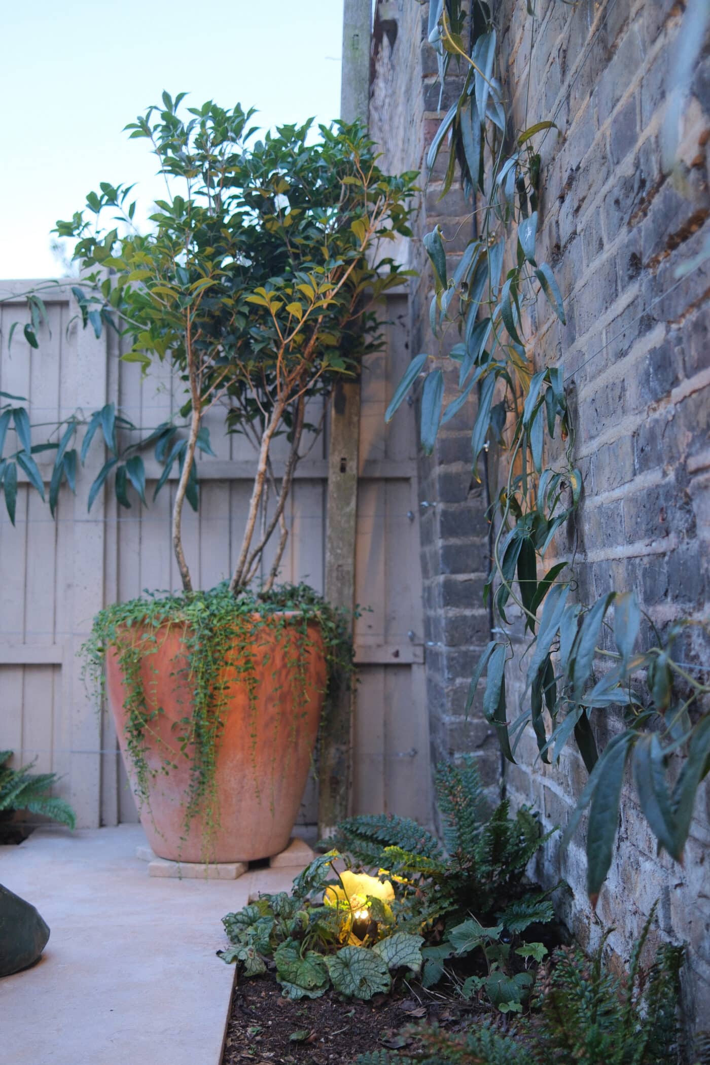 At the shady end of the garden sits a low-light-loving bed filled with Brunnera, ferns and yet-to-emerge Hostas. Underlighting will really set these off come summer.