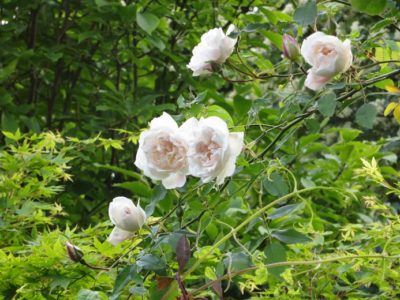 For training against a wall or fence – a climbing rose for sun, and pink jasmine for shade. Plants may vary by season.