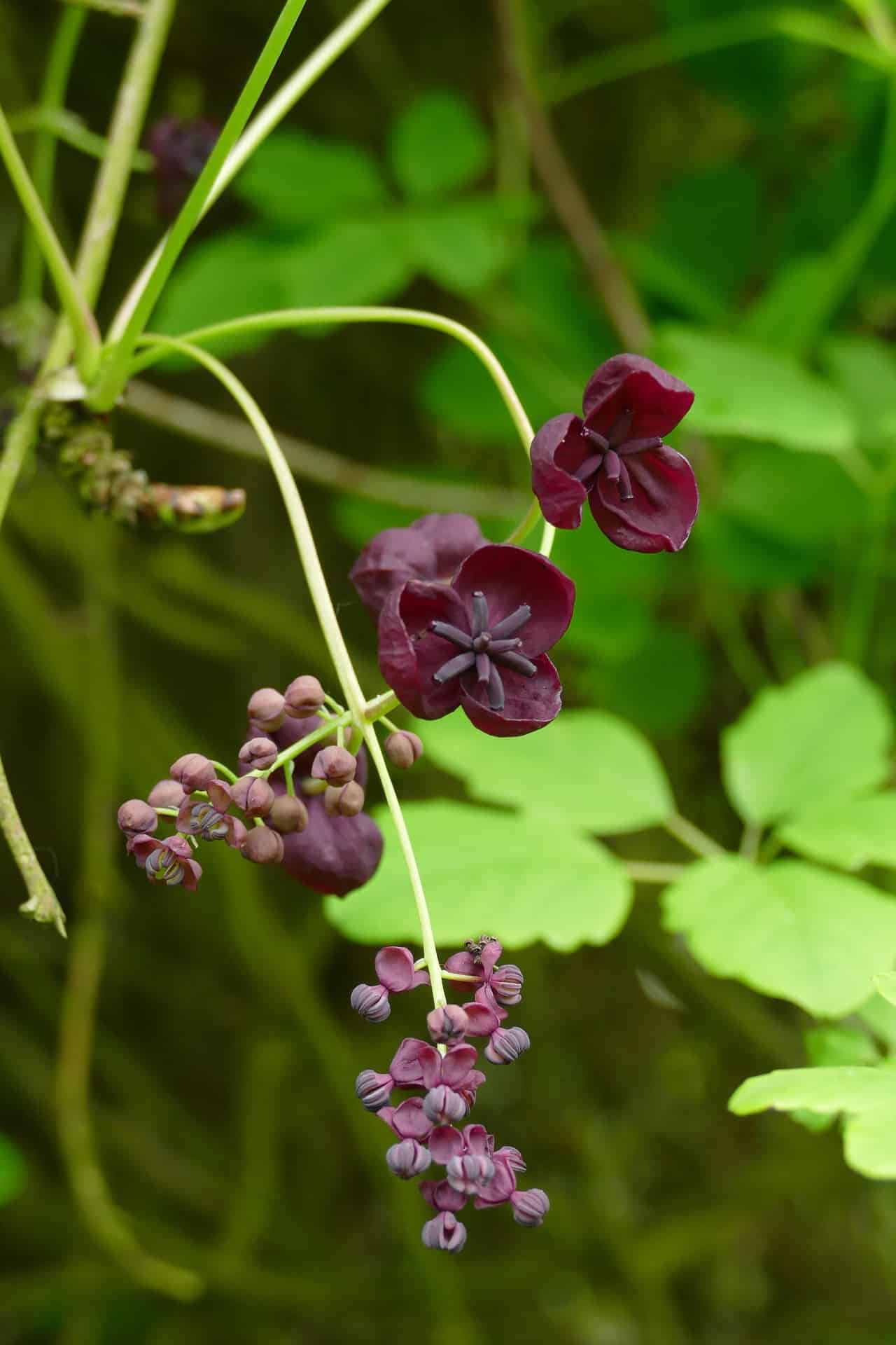 For training against a wall or fence – a striking Passiflora for sun, and Akebia quinata for shade. Plants may vary by season.